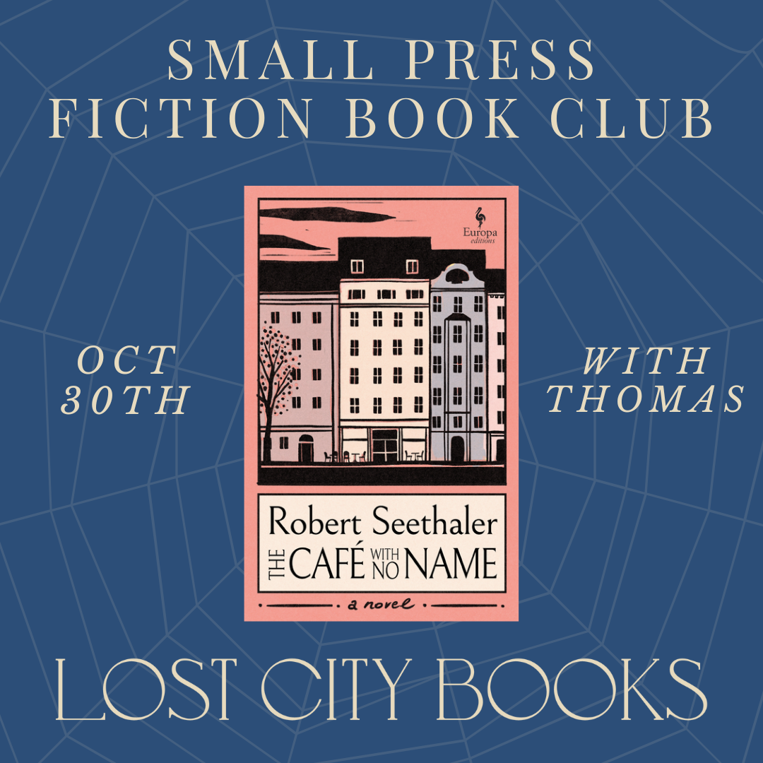 Small Press Book Club will be meeting Thursday, October 30th at 7pm. We will be reading THE CAFE WITH NO NAME by Robert Seethaler, published by Europa Editions.